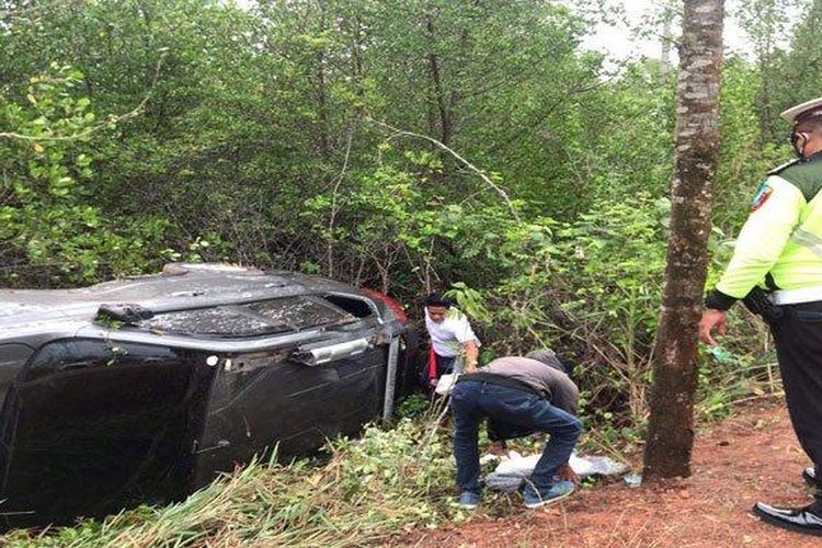 Nissan X-Trail rebahan di semak-semak usai gagal nyalip kendaraaan di depan dan berakhir tumbuk pohon