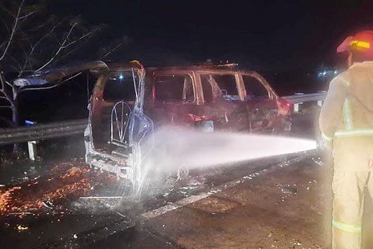 Suzuki APV yang menjadi mobil jenazah terbakar di ruas tol Jombang-Mojokerto usai antar jenazah di kota Surabaya