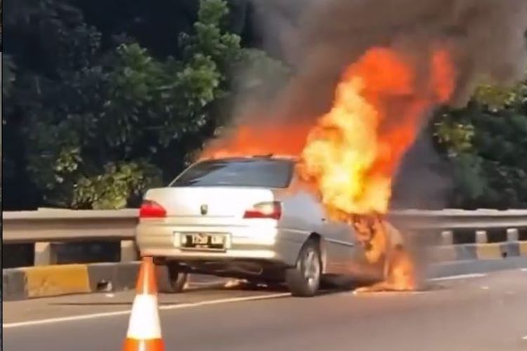 Peugeot 406 terbakar habis di tol JORR, Cipayung, Jakarta Timur yang diawali kepulan asap di bahu jalan