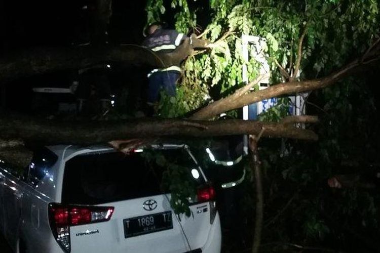Pohon tumbang akibat angin kencang di Subang, Jawa Barat menimpa atap Toyota Kijang Innova Reborn yang tengah parkir