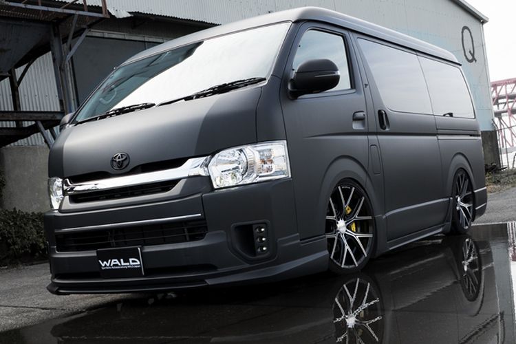 Modifikasi Toyota HiAce ini bisa dibilang simpel tapi tetap memunculkan kesan elegan. Kelir hitam dan body kit Wald jadi daya tarik tersendiri