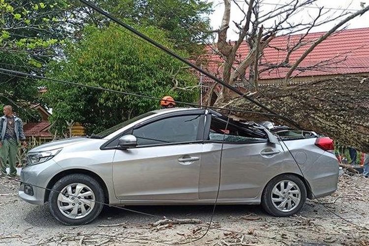 Pohon tumbang timpa Honda Mobilio di kota Pekanbaru hingga atap gepeng nempel jok tapi pengemudi berucap syukur