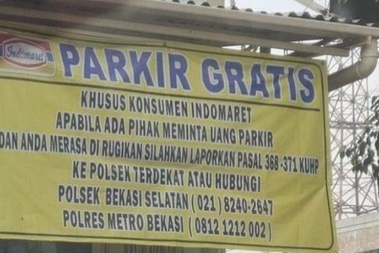 Indomaret di kota Bekasi berani bentangkan spanduk bertuliskan PARKIR GRATIS dengan isi ancaman pasal bagi yang maksa minta ongkos