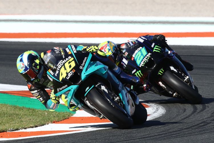Franco Morbidelli finish di posisi 11 MotoGP Italia di sirkuit Valencia. Tepat di depannya ada pembalap, mentor sekaligus idolanya, Valentino Rossi.