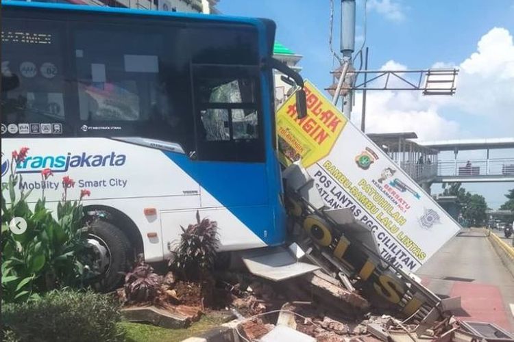 Bus TransJakarta tabrak Pos Polisi Lalu Lintas PGC Kramat Jati gara-gara dongkrak jatuh menimpa pedal gas