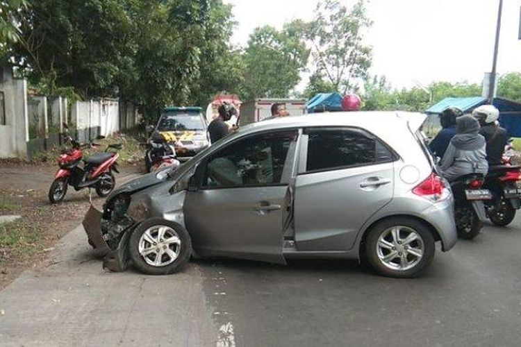 Honda Brio banting ke kiri tabrak pohon, roda kiri patah ulah motor dari arah berlawanan makan jalan di Cianjur