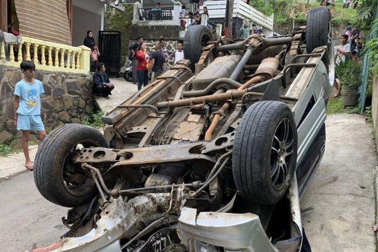 Mitsubishi Kuda berisi 10 penumpang terbalik di jalan menurun kawasan Lembang, kabupaten Bandung Barat