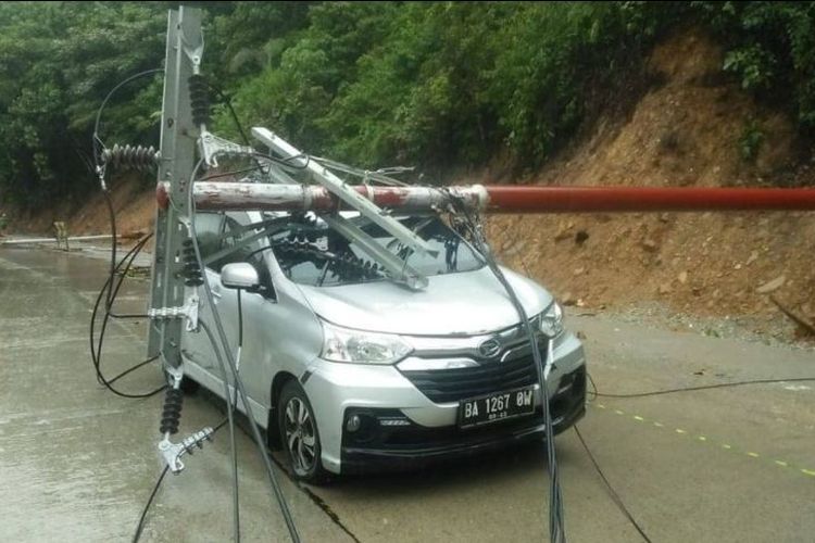 Daihatsu Xenia tertimpa tiang listrik ambruk akibat kabel disabet pohon tumbang di Lubuk Peraku, Lubuk Kilangan, kota Padang