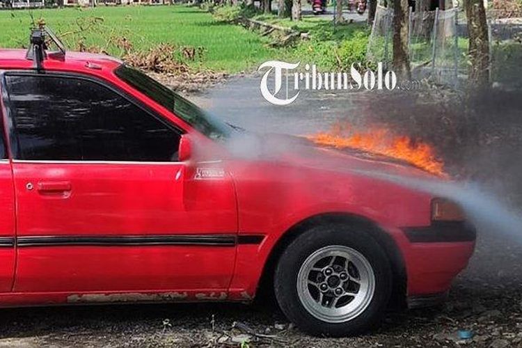Wisatawan Lagi Berlibur Heboh, Api di Kap Mesin Mazda 323 Bikin Panik
