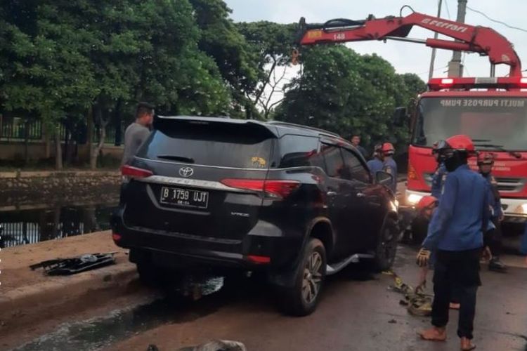 Toyota Fortuner tercebur ke dalam kali di Cilincing, Jakarta Utara karena reflek pengemudi banting setir ke kiri hindari motor