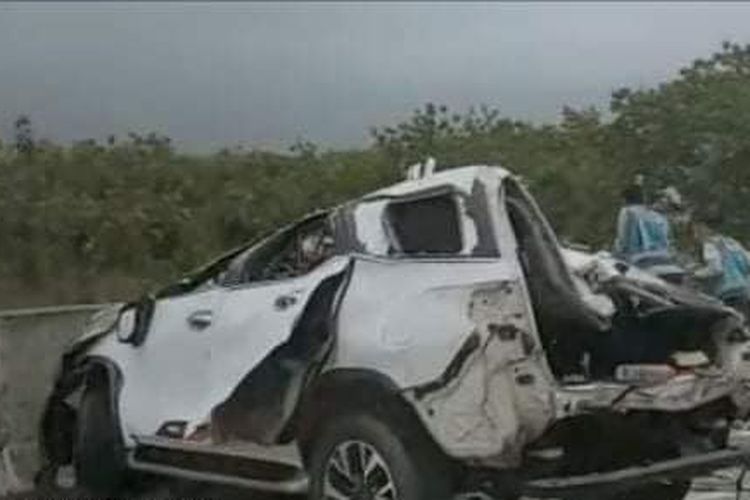 Petaka maut menimpa Toyota Fortuner berisi satu keluarga asal Sleman, Yogyakarta di ruas tol Solo-Ngawi, terbalik hingga hancur