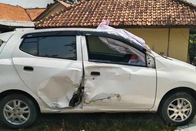 Daihatsu Ayla ringsek di bodi kanan usai kesenggol Suzuki Satria F150 dari arah berlawanan di kawasan Gentong, Kadipaten, Tasikmalaya