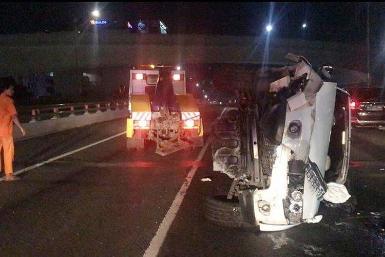 Mitsubishi Pajero Sport terguling usai banting setir saat dihalang-halangi truk boks di tol dalam kota.