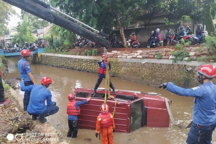 Petugas damkar menggunakan crane saling bekerja sama menarik Kijang Grnad Extra yang nyebur ke kali di pagi hari