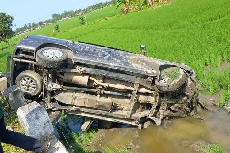 Kijang Innova nungging masuk areal sawah sampai wajah kotor kena tanah. Kejadian berawal saat pengemudi ngantuk