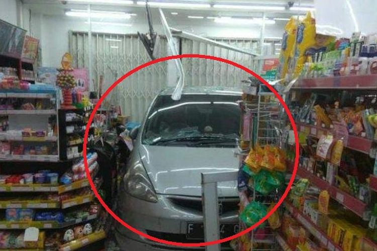 Honda Jazz GD3 labrak minimarket hingga berhenti di depan kasir sebabkan dua pengunjung terluka di kabupaten Bandung Barat