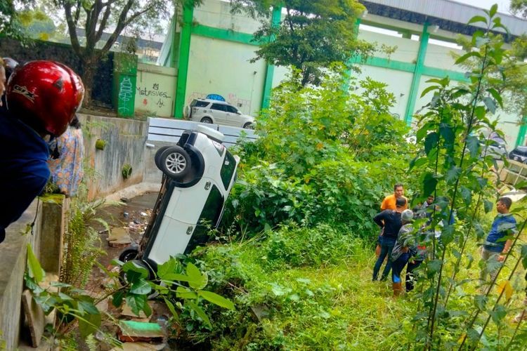 Daihatsu Terios nyungsep di kali dengan kondisi nyaris terbalik di Salatiga. Diduga niat injak rem tapi malah injak gas