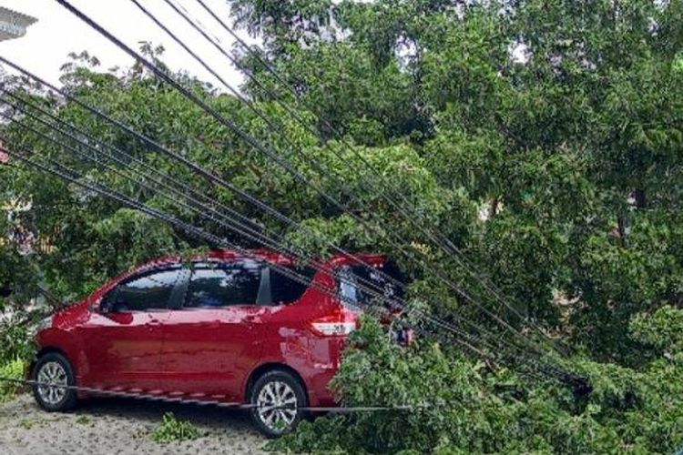Suzuki Ertiga retak kaca dan penyok di bagian atap usai digebrak pohon tumbang. Pemilik bakal minta ganti rugi ke DLH