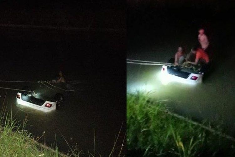 Toyota Yaris yang tenggelam di sebuah saluran irigasi berhasil ditarik warga. Kaca depan pecah, kondisi pengemudi tak bernapas