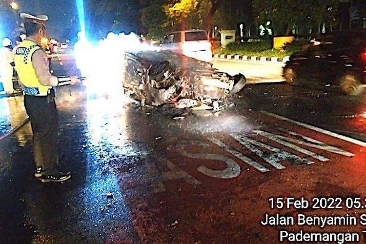 Honda Jazz terbalik kondisi hangus terbakar di Pademangan, Jakarta Utara. Mobil dibawa wanita ini oleng tabrak trotoar dan pot bunga