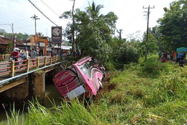 Bus Pariwisata anjlok ke sungai usai mengalami oleng di Banyumas. Akibat kecelakaan ini, dua orang mengalami luka-luka