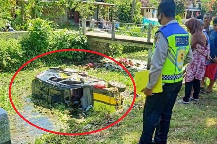Daihatsu Taruna berisi empat orang terjang pembatas lalu terbang mendarat ke Kali Peni di Kulon Progo, seisi kabin bau comberan