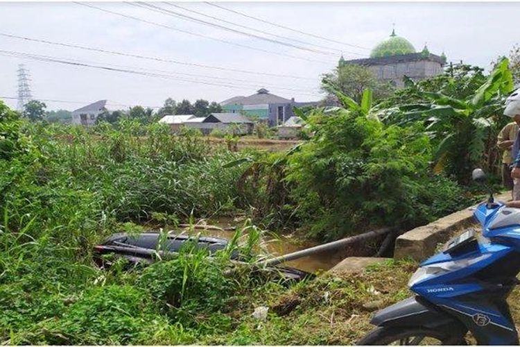 Toyota Rush setengah badan rebahan di sungai, diduga pengemudi ngantuk. Peristiwa ini juga jadi tontonnan wrga sekitar