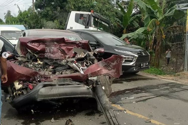 Honda CR-V adu banteng musuh truk trailer di jalan trans Kalimantan, Mataraman, Banjar, Kalsel hingga terburai parah