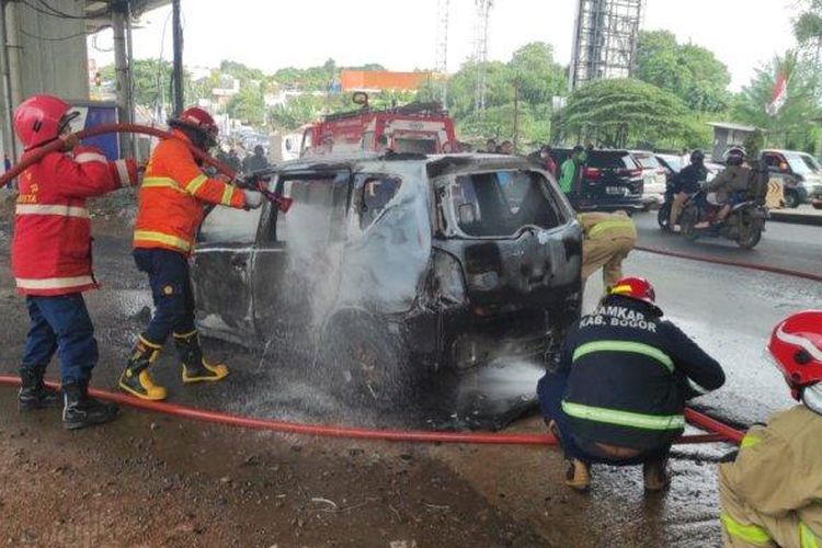 Nissan Grand Livina terbakar habis di Gunungputri, kabupaten Bogor, api baru padam setelah butuh waktu 30 menit