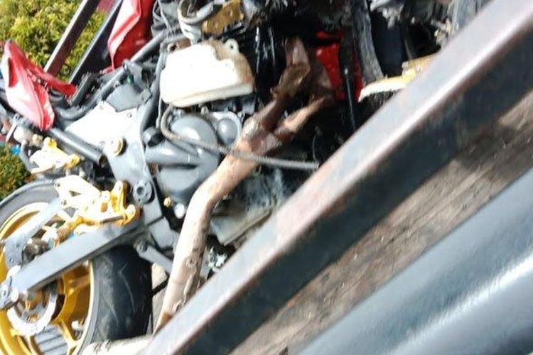 Kawasaki NInja 250 ringsek parah usai ngebut dari jauh dan menghantam truk dump di tikungan jalan. Pemotor meregang nya