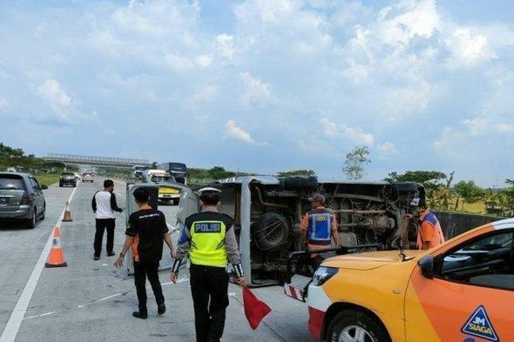 Imbas ban belakang kanan rewel saat sedang melaju di Tol Caruban-Nganjuk, Toyota HiAce isi 11 orang terguling hingga bodi rusak