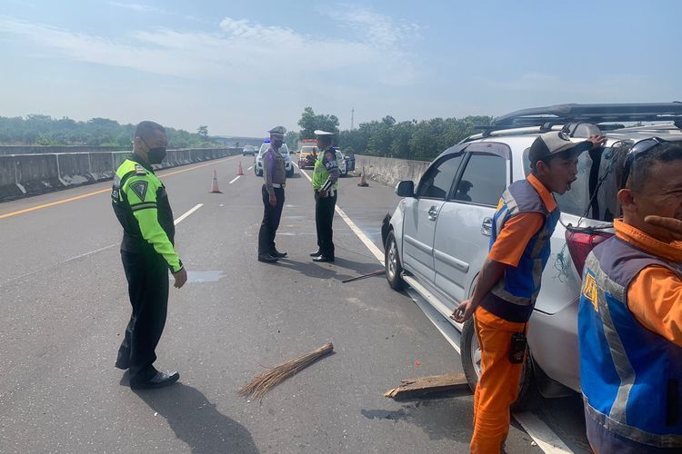 Daihatsu Terios rebahan usai kena sundul Mitsubishi Xpander dari belakang di tol Madiun-Surabaya. Dua orang luka akibat kecelakaan ini