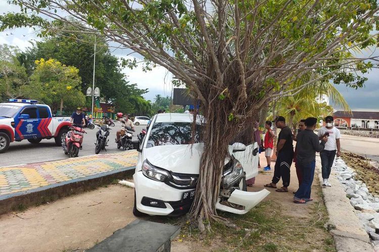 Honda Mobilio nyaris masuk ke pantai usai hilang kendali dibawa emak-emak. Untung saja masih tertahan oleh pohon