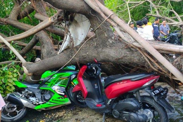 Sebanyak tujuh motor mulai Kawasaki Ninja 250, Yamaha NMAX sampai Lexi remuk tuntas ditebas pohon tumbang di cucian motor Pulogadung