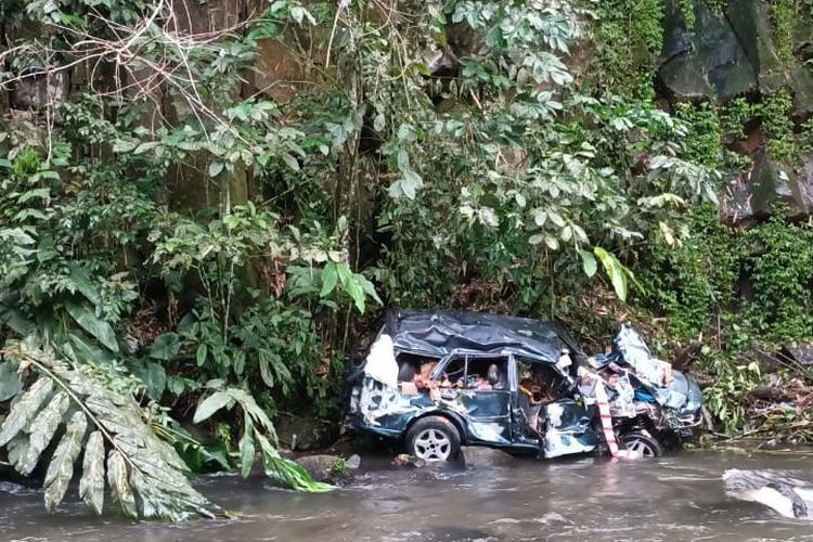 Mazda Vantrend remuk di dasar jurang sedalam 30 meter usai pengemudi diduga ngantuk dan tidak konsentrasi saat berkendara