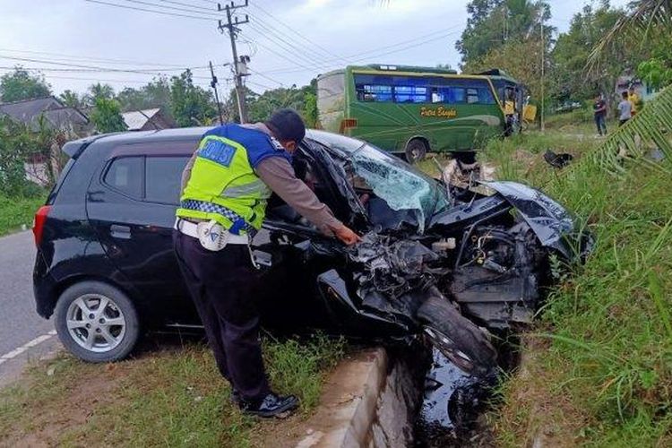 Bodi Daihatsu Ayla rontok depan, sebagian terpenggal musuh bus medium di desa Cit, Riausilip, Bangka telan satu nyawa