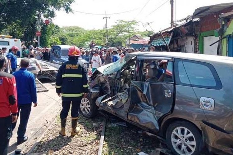 Toyota Kijang Innova hancur lebur ditusuk ular besi pengangkut BBM di Klojen, kota Malang akibat mati mesin di atas rel