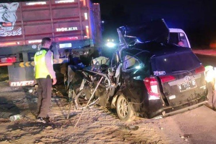 Toyota Calya isi 9 orang menghujam kencang ke arah bagian belakang truk parkir hingga engakibatkan 5 orang meninggal dunia