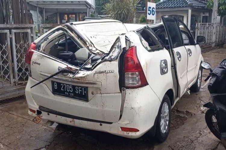 Atap Daihatsu Xenia amblas membuat seorang ibu dan dua anak balita nyaris tewas, tertimpa pohon di Jl RS Fatmawati Raya, Cilandak, Jakarta Selatan