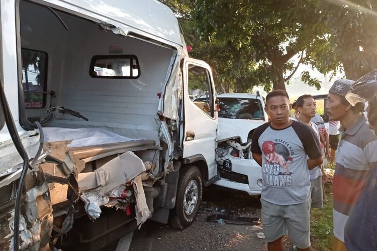 Ambulans pengangkut jenazah disambut Toyota Rush dari arah berlawanan setelah ditoyor truk towing dari depan di Probolinggo