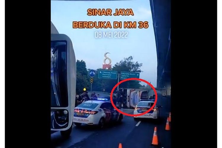 Bus PO Sinar Jaya berisi 54 pemudik arus balik lebaran 2022 terguling di KM 37 tol Jakarta-Cikampek, tusuk beton pembatas