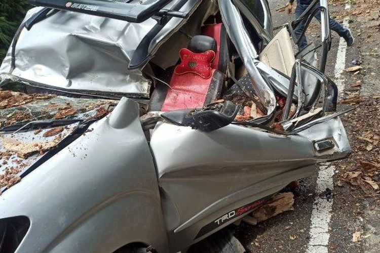 Daihatsu Xenia berisi satu keluarga lima orang hancur, atap dan kabin ambrol ditebas pohon tumbang, satu penumpang tewas