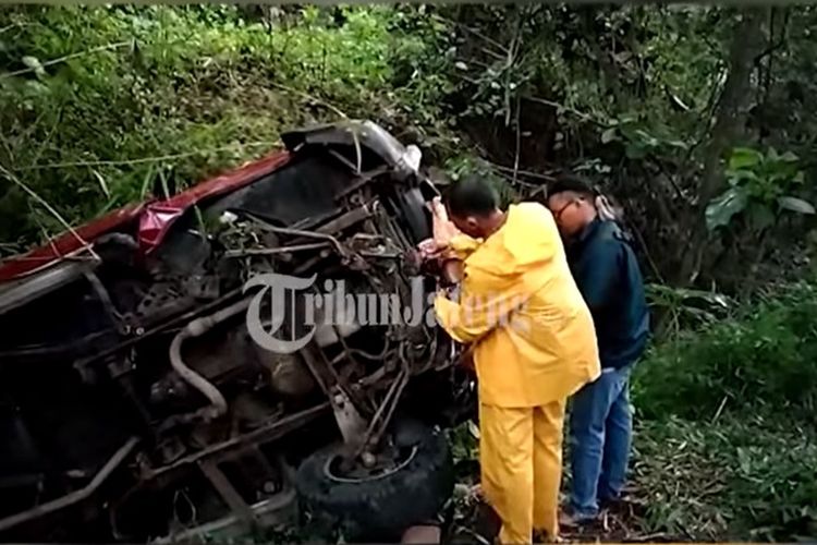 Isuzu Panther isi 7 penumpang terperosok ke pinggir jalan yang menurun dan tertahan pohon bambu. Begioni kronologinya