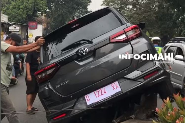 Video Toyota Raize GR Sport bau dealer dan masih pakai pelat provit tabrak dan nangkring di atas pembatas jalan kota Cimahi, Jawa Barat