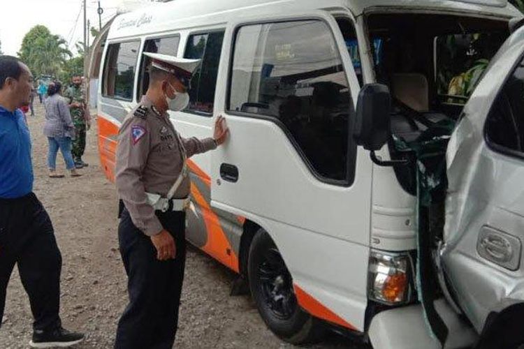 Isuzu Elf pontang-panting hajar Daihatsu Gran Max lalu mental nonjok Panther parkir di jalan raya Blitar-Kediri, desa Dandong, Srengat, Blitar