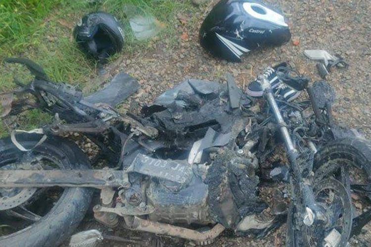 Honda CBR150R seketika meleleh hingga gosong setelah dilindas dan diseret truk tangki di Palang, Tuban, satu orang lepas nyawa