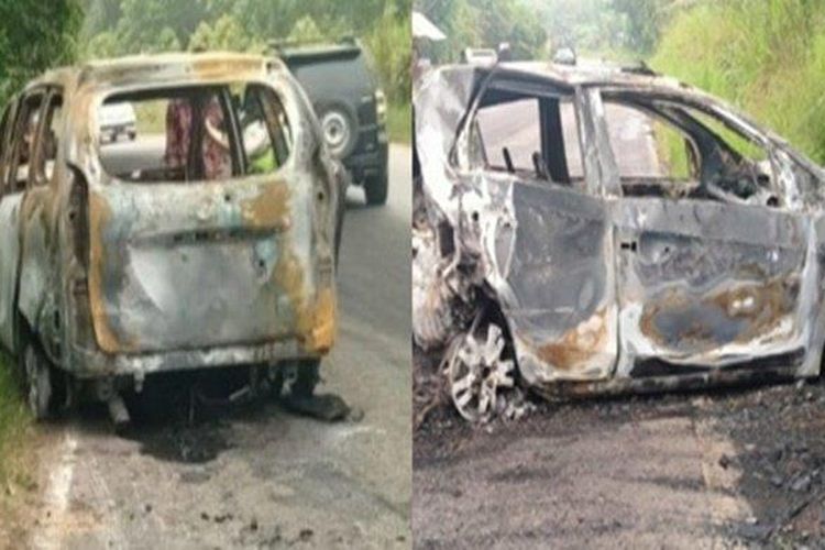 Toyota Avanza dan Honda Brio terbakar hingga sisa rangka setelah keduanya tabrakan di desa Tabat Agung, Rambang Niru, Muara Enim