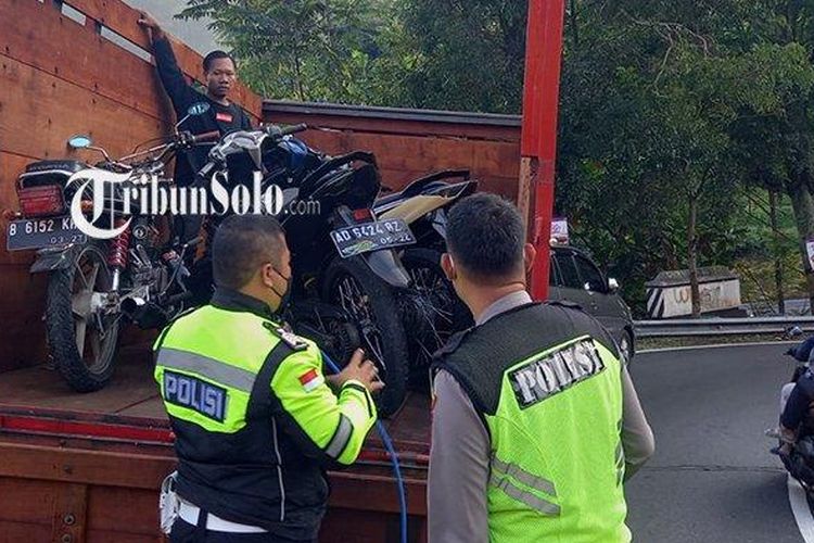 Aksi keplek miring di Tawangmangu viral, tak berapa lama esoknya polisi melakukan razia. Puluhan motor diangkut pakai truk