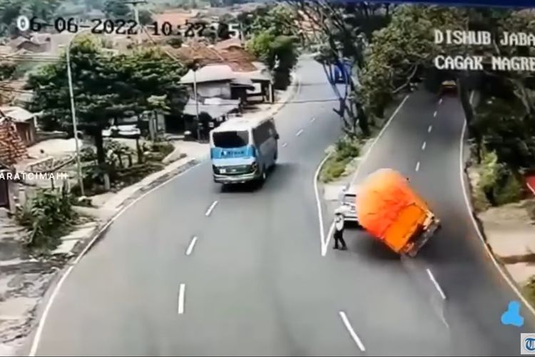 Nyaris saja, anggota polantas ini hampir tertabrak truk kalau saja telat sedikit saja berjalan sekitar 3 langkah