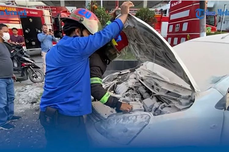 Nissan Grand Livina terbakar di awali pemilik cium bau gosong saat hendak isi bensin di SPBU Medan Tembung, spontan disemprot racun api